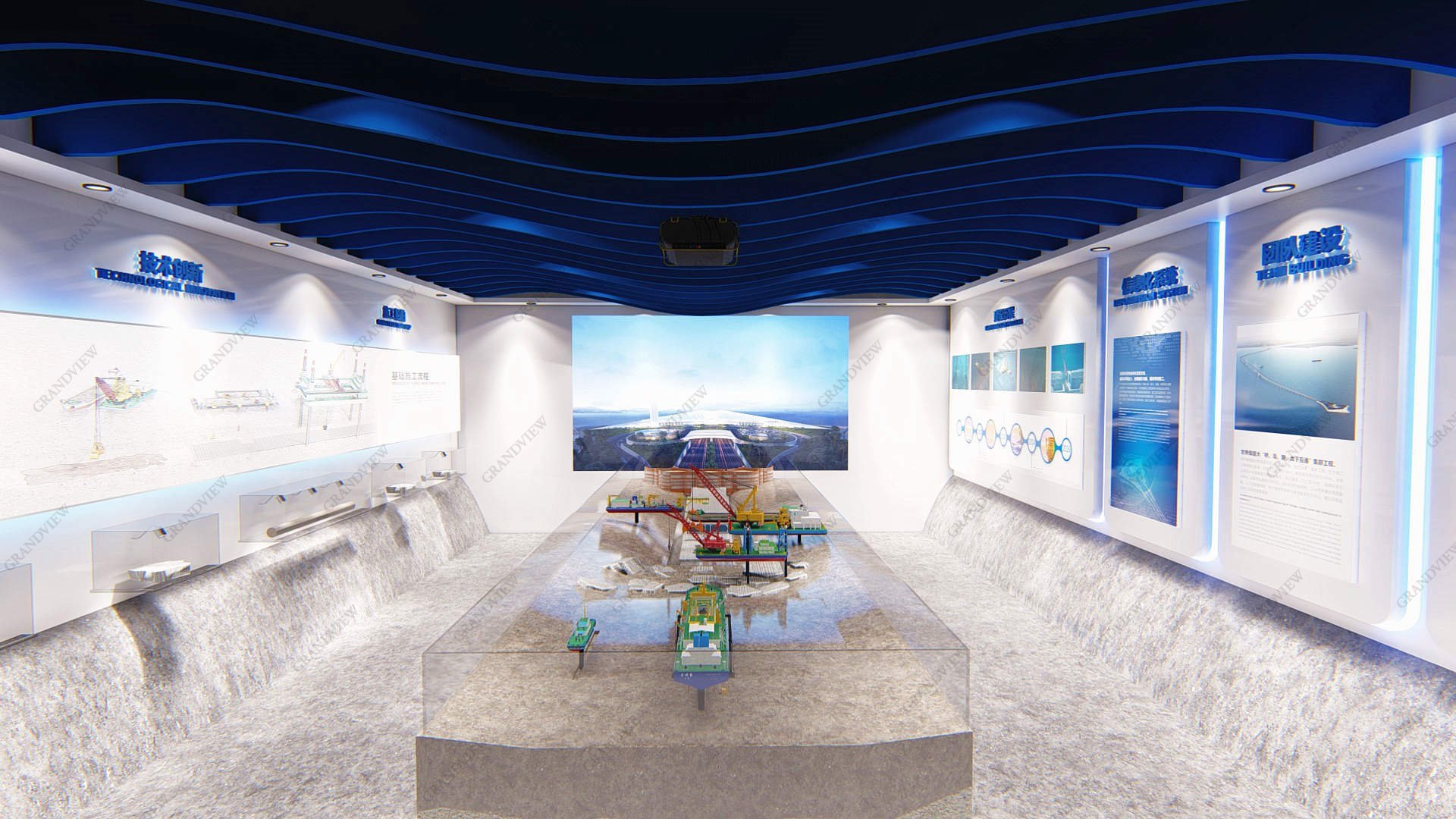 廣航局展廳根據沉管安裝和東西人工島建設,采用深塢門及沉管元素打造,按照施工的流程做成長達8米的巨型沙盤模型,外觀形象、顏色鮮明,并以波浪形的頂部格柵和黃褐色的地基展示海上及海下場景,線條極其優美簡約。