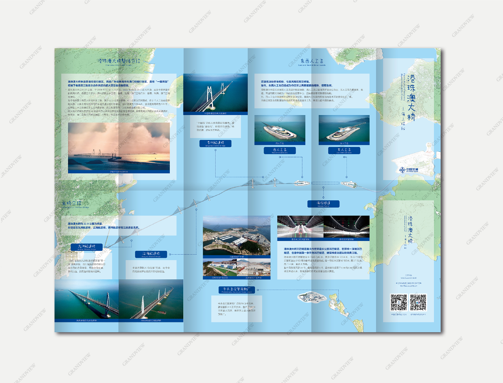港珠澳大橋的總體概況描述將往日趨于神秘的港珠澳大橋形象立體地躍然于折頁之上;大橋建設工藝點的詳細介紹展現其技術之復雜、施工難度之高、工程規模之龐大;三座主橋的橋塔設計介紹展示了大橋融現代簡約風格與華夏文明諸元素于一爐的深刻寓意。
