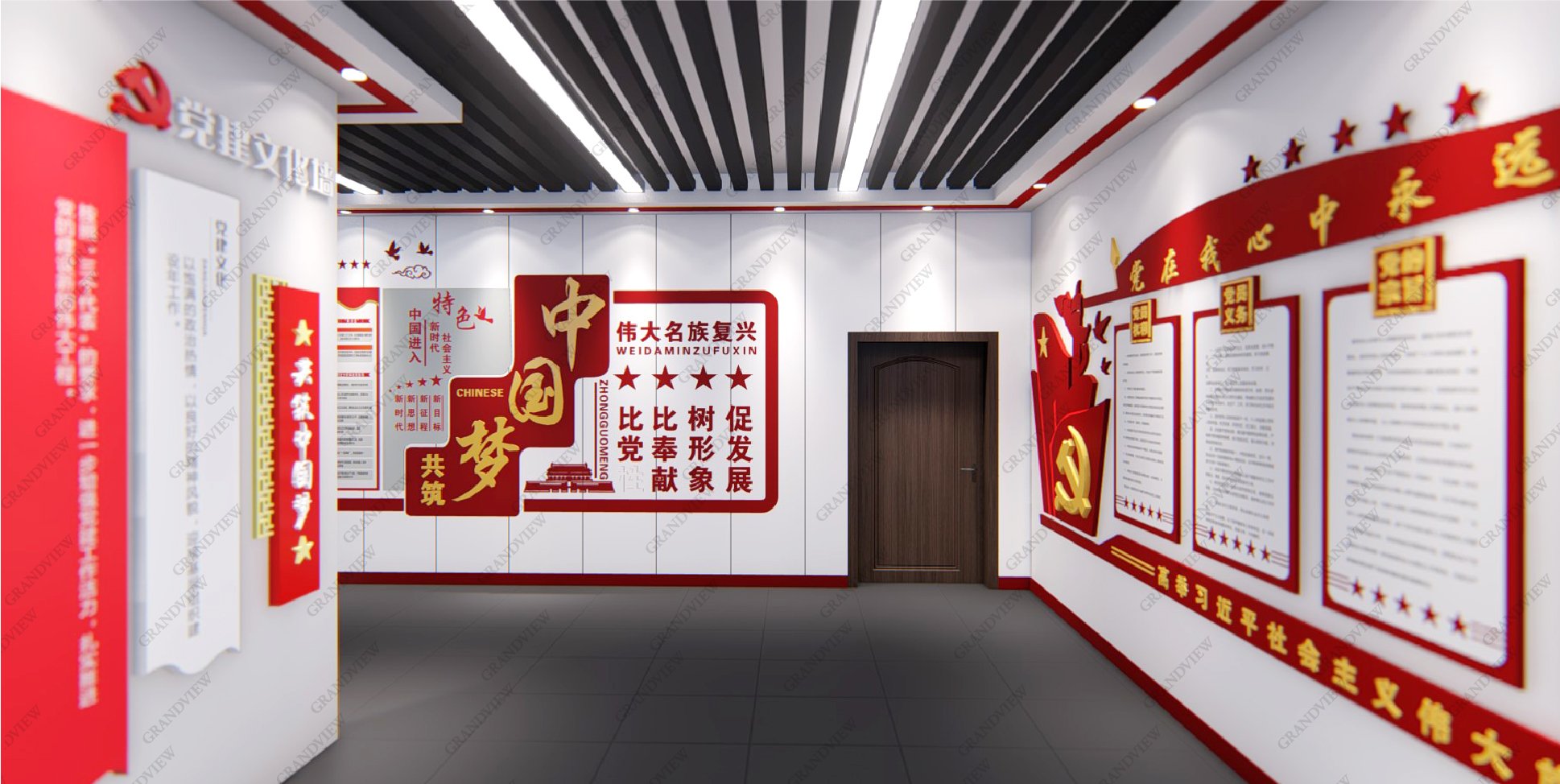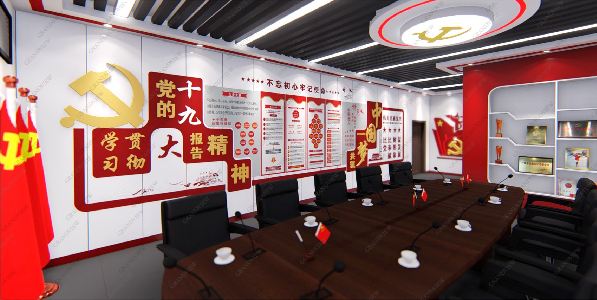 對外,可展示黨的歷程和發展故事,學習黨的精神,感受黨的莊嚴和神圣;對內,可進行黨建會議的召開,促進廣州地鐵十二號線的高質量發展,防火的搪瓷鋼板元素的采用與地鐵的實際情況相符,大量紅色元素的應用產生強烈的視覺沖擊。