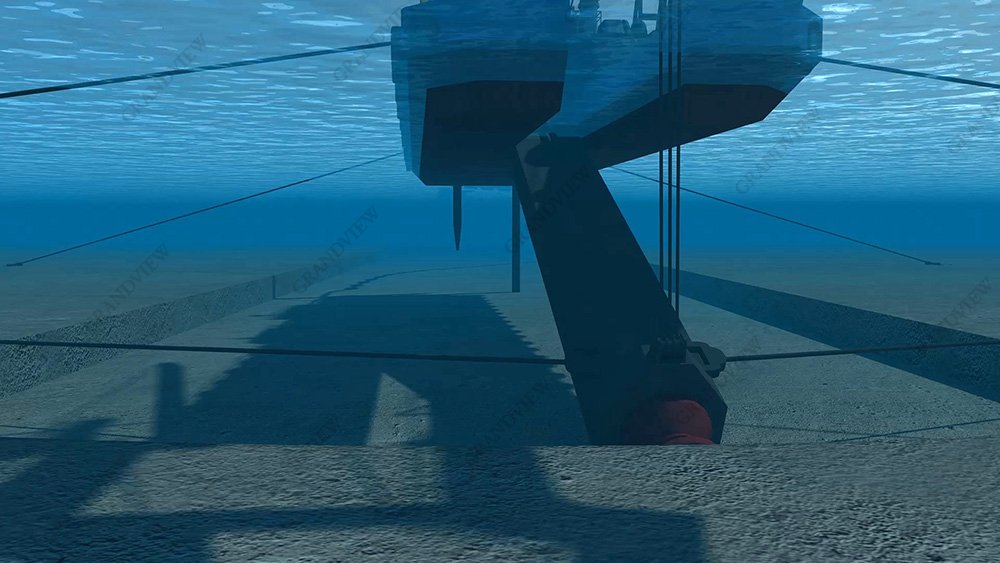 水下仰視角度,觀看船舶施工過程,水底配合深藍柔霧效果,以及焦散貼圖,第一人稱的視覺體驗,斷面半剖展示,360度展示運動原理,廣角動畫制作,精益求精。
